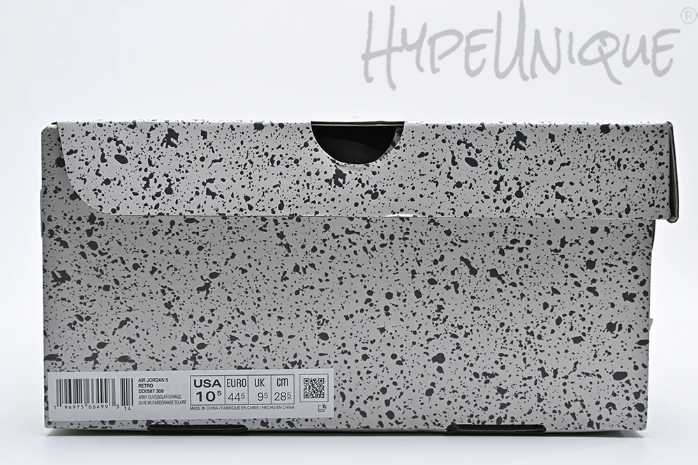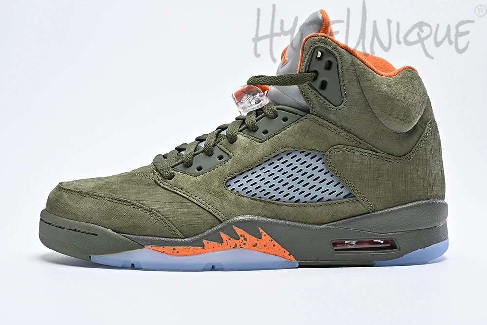 One of the earliest non-OG colorways of the Air Jordan 5 Retro, the ‘Olive’ features a suede upper with tonal shades of green on the mesh midfoot panel and the eyestays. Bright accents come via the orange inner lining and metallic silver finish on the tongue, where a translucent lace toggle rests just below a Jumpman logo. The midsole shark tooth graphic, arguably the defining feature of the Air Jordan 5, sports a speckled pattern.